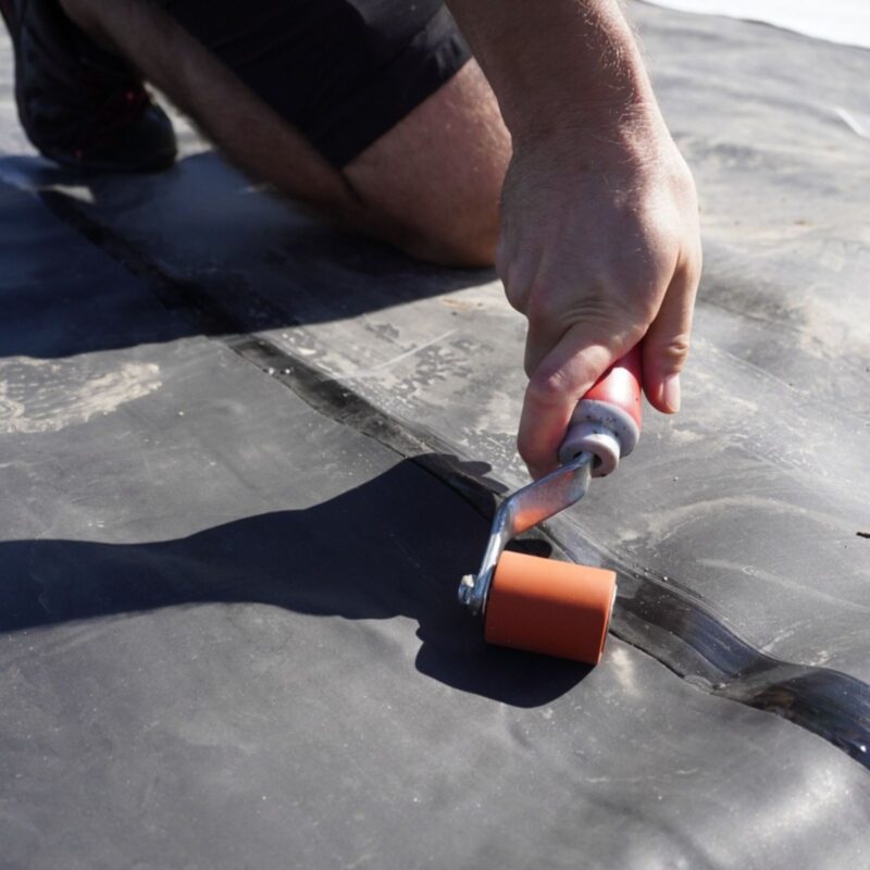 Połączenie należy dokładnie docisnąć przy użyciu dużego wałka QuickRoller lub małego wałka silikonowego o szerokości 50 mm. Początkowo należy wałkować prostopadle do kierunku ułożenia taśmy, a następnie równolegle wzdłuż obu krawędzi taśmy klejącej. To zapewni solidne i równomierne łączenie EPDM.