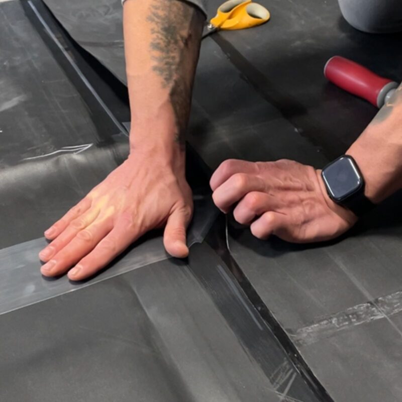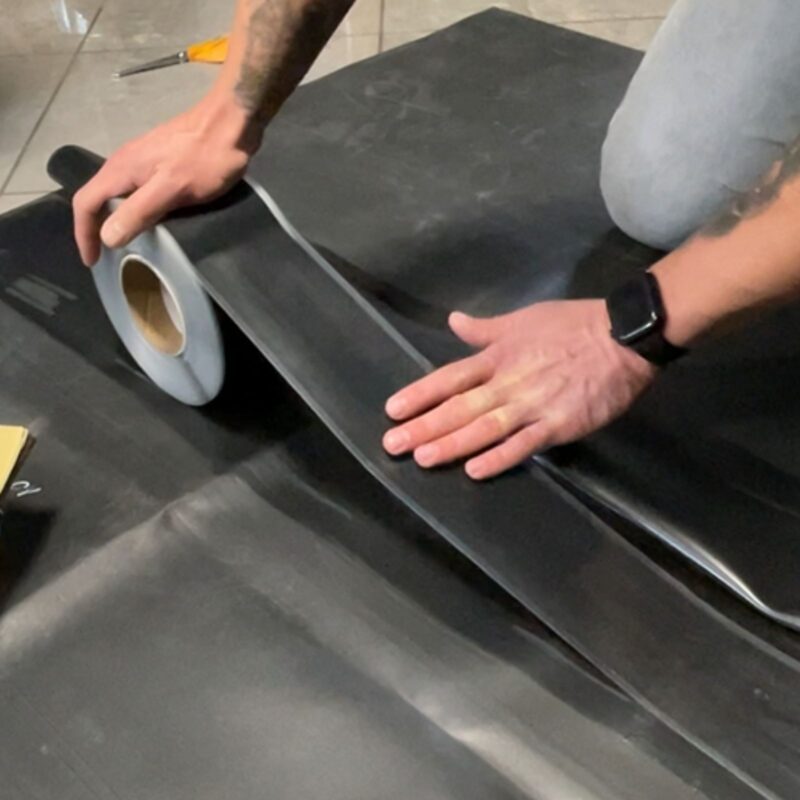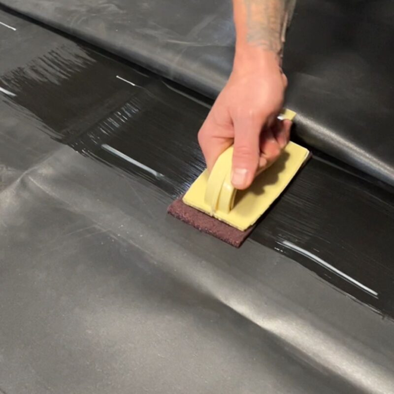 Odgina się górny arkusz folii, a następnie tymczasowo przykleja co 1,5 m za pomocą środka gruntującego QuickPrime Plus. To zapewnia właściwe ułożenie folii podczas procesu sklejania.